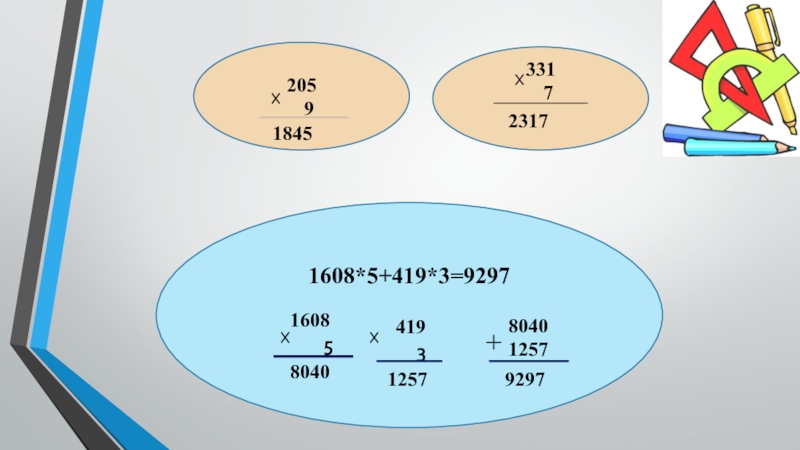 205  9331  7   1845  23171608*5+419*3=9297 1608    5
