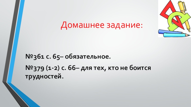 Домашнее задание:№361 с. 65– обязательное.№379 (1-2) с. 66– для тех, кто не боится трудностей.