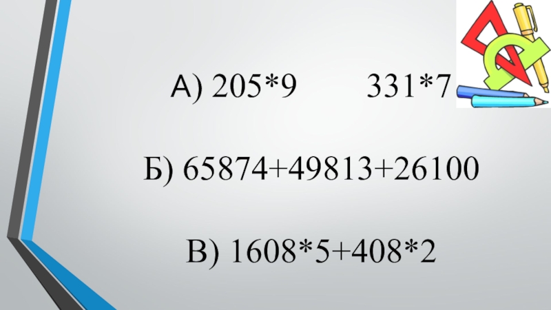 Слайд 7А) 205*9 331*7 Б) 65874+49813+26100 В) 1608*5+408*2