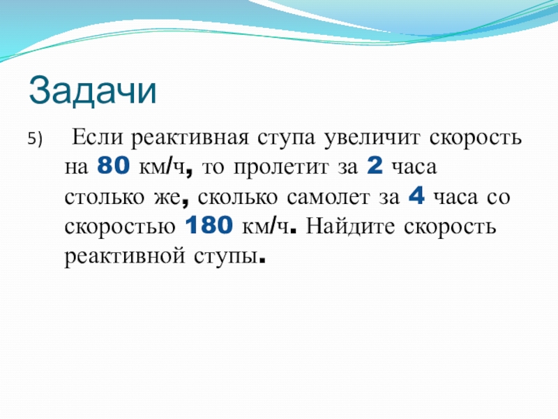 Задачи Если реактивная ступа увеличит скорость на 80 км/ч, то пролетит за 2 часа столько же, сколько