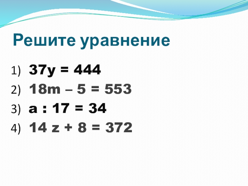 Решите уравнение 37y = 44418m – 5 = 553a : 17 = 3414 z + 8 =