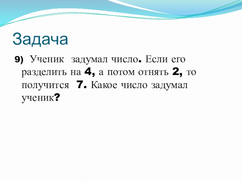 Задача 9) Ученик задумал число. Если его разделить на 4, а потом отнять 2, то получится 7.