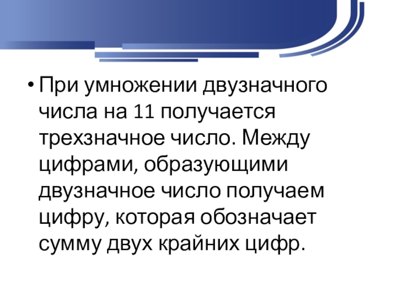Слайд 3При умножении двузначного числа на 11 получается трехзначное число. Между цифрами,
