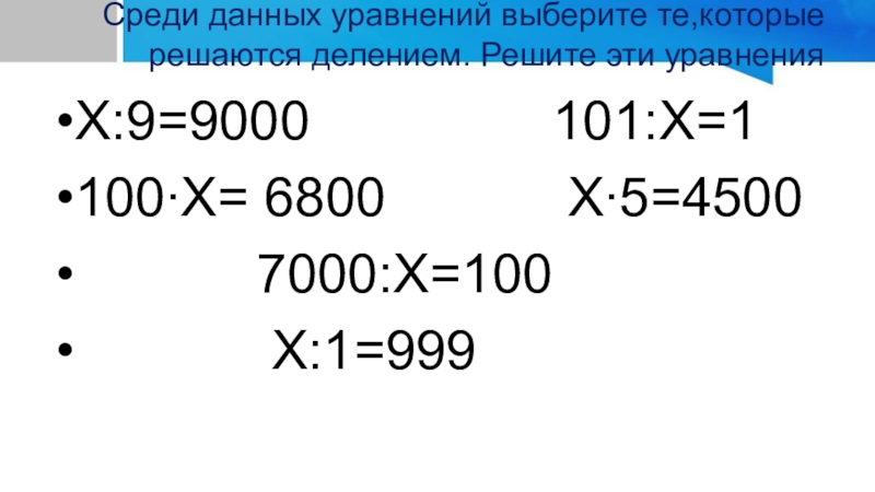 Слайд 3Среди данных уравнений выберите те,которые решаются делением. Решите эти уравнения
