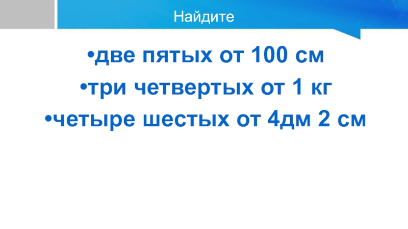 Найдитедве пятых от 100 смтри четвертых от 1 кгчетыре шестых от 4дм 2 см