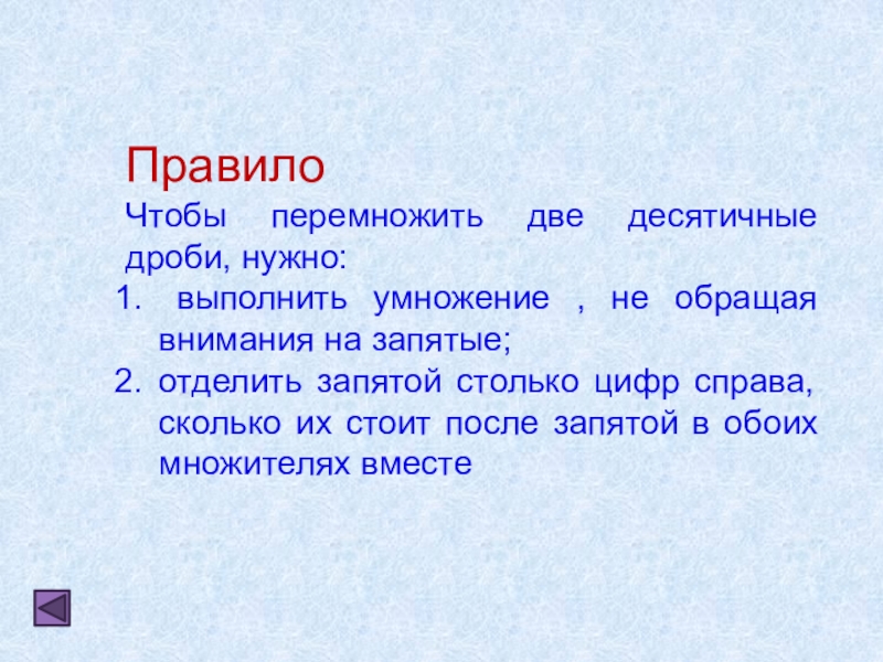 ПравилоЧтобы перемножить две десятичные дроби, нужно: выполнить умножение , не обращая внимания на запятые;отделить запятой столько цифр