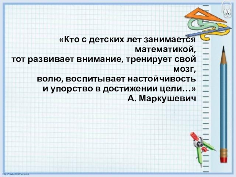 «Кто с детских лет занимается математикой, тот развивает внимание, тренирует свой мозг, волю, воспитывает настойчивость и упорство в достижении цели…» А. Маркушевич