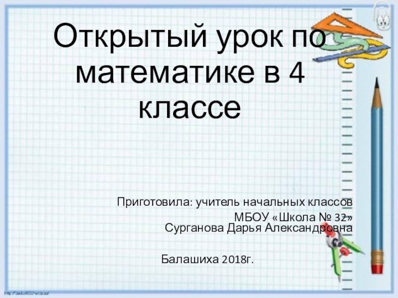 Открытый урок по математике в 4 классе Приготовила: учитель начальных классов МБОУ «Школа № 32» Сурганова Дарья