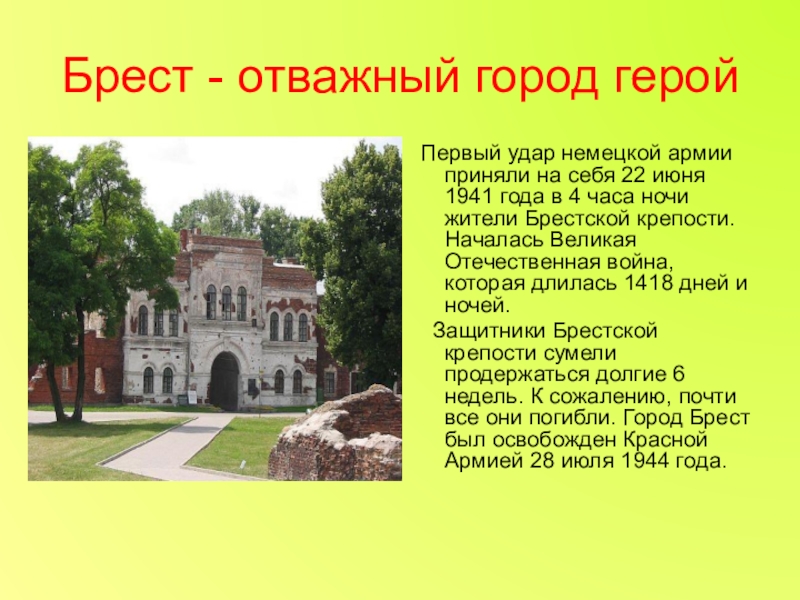 себя 22 июня 1941 года в 4 часа ночи жители Брестской крепости. Началась Великая Отечественная война, которая длилась 1418 дней и ночей.