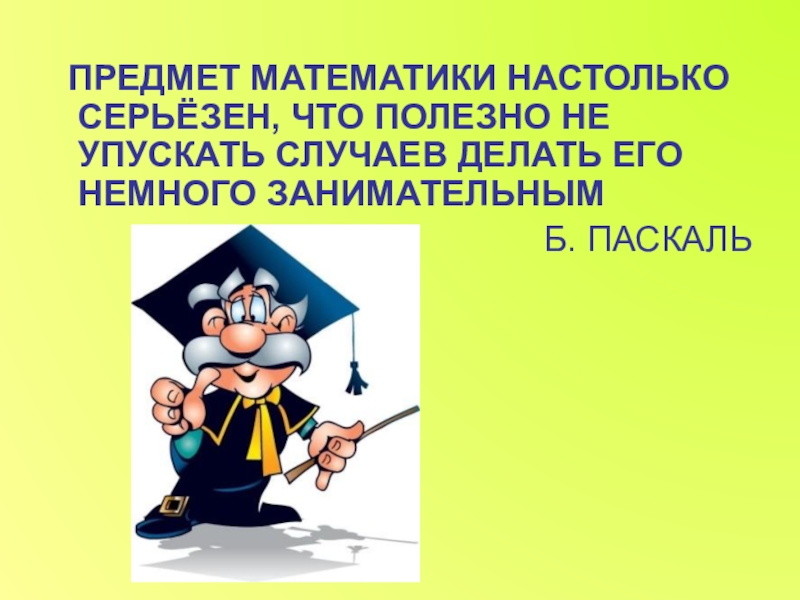 Слайд 3 ПРЕДМЕТ МАТЕМАТИКИ НАСТОЛЬКО СЕРЬЁЗЕН, ЧТО ПОЛЕЗНО НЕ УПУСКАТЬ СЛУЧАЕВ ДЕЛАТЬ