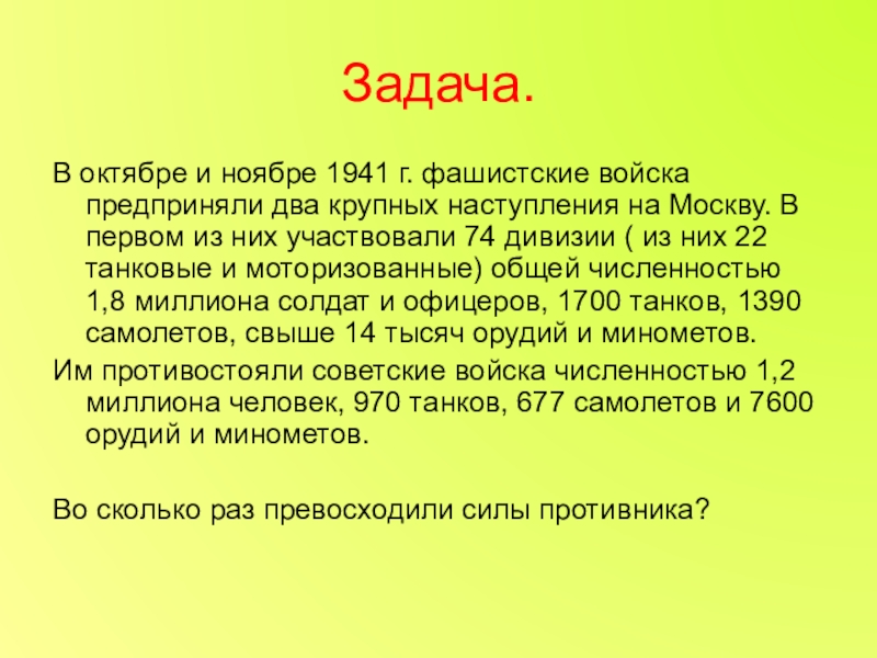 наступления на Москву. В первом из них участвовали 74 дивизии ( из них 22 танковые и моторизованные) общей численностью 1,8 миллиона солдат и офицеров, 1700 танков, 1390 самолетов, свыше 14 тысяч орудий и минометов.