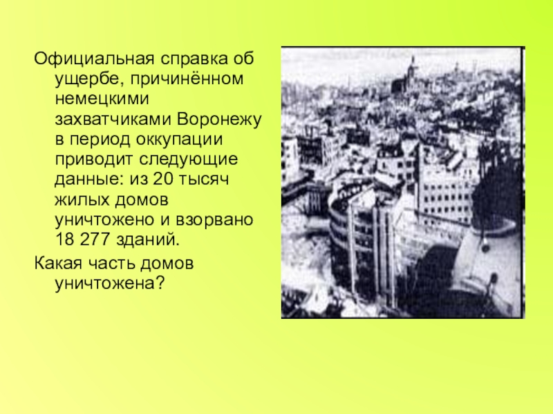 Слайд 19Официальная справка об ущербе, причинённом немецкими захватчиками Воронежу в период оккупации