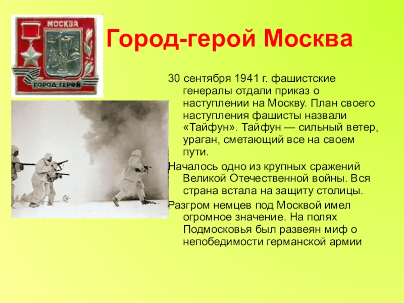 отдали приказ о наступлении на Москву. План своего наступления фашисты назвали «Тайфун». Тайфун — сильный ветер, ураган, сметающий все на своем пути.