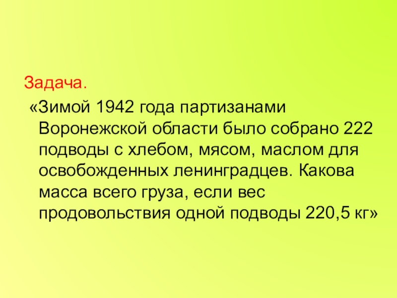 с хлебом, мясом, маслом для освобожденных ленинградцев. Какова масса всего груза, если вес продовольствия одной подводы 220,5 кг»
