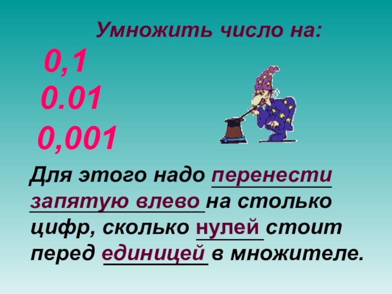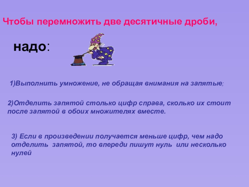 3) Если в произведении получается меньше цифр, чем надо отделить запятой, то впереди пишут нуль или несколько нулей