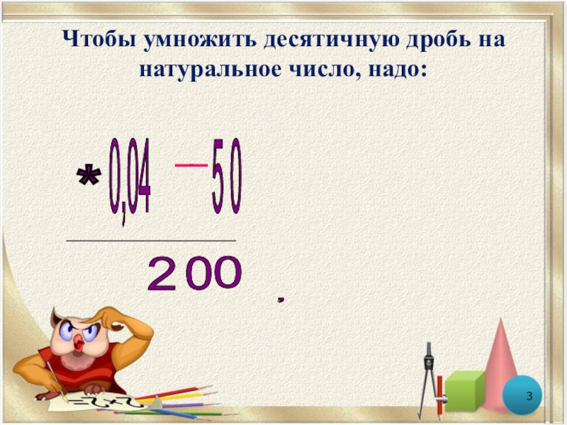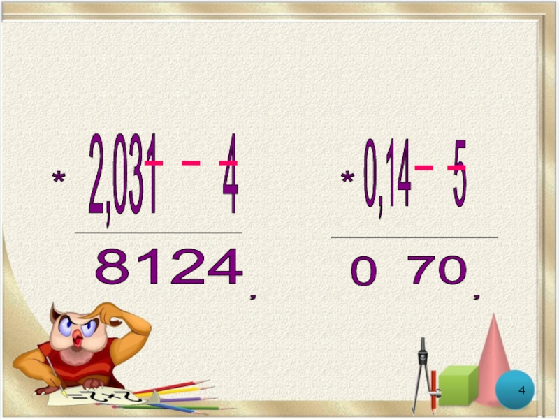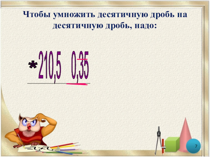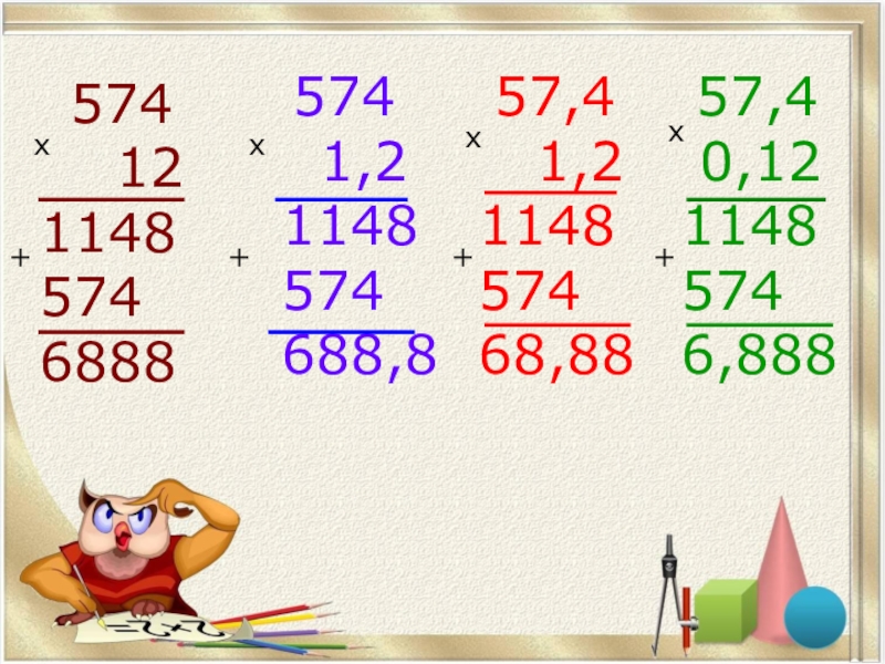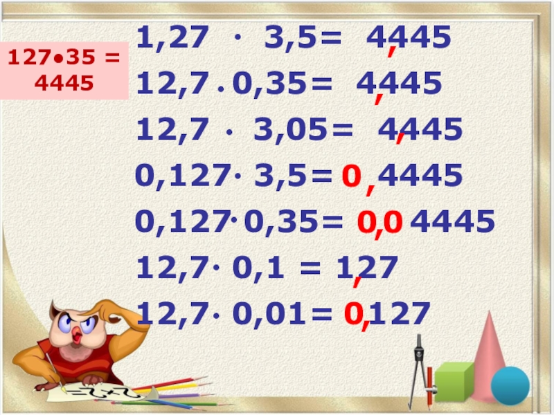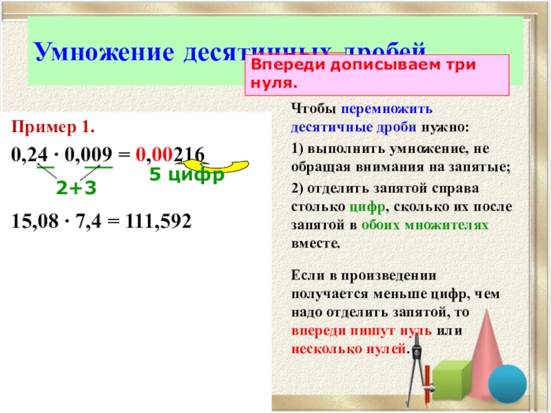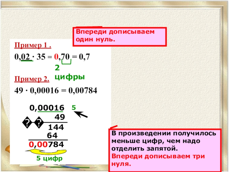 4. Если в произведении цифр окажется меньше, чем нужно отделить запятой, то недостающие цифры заменить нулями и приписать их слева в произведении.
