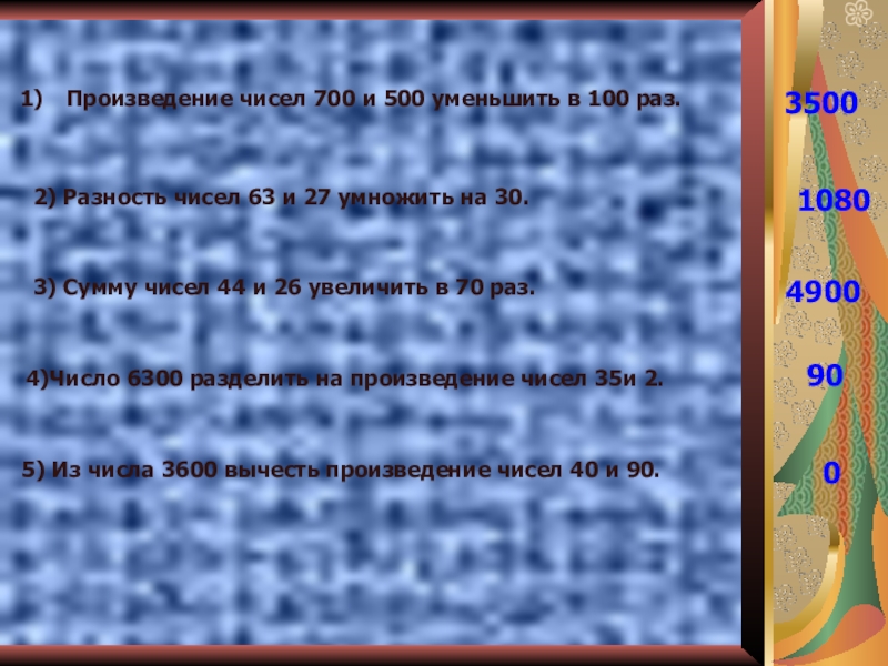 5) Из числа 3600 вычесть произведение чисел 40 и 90.