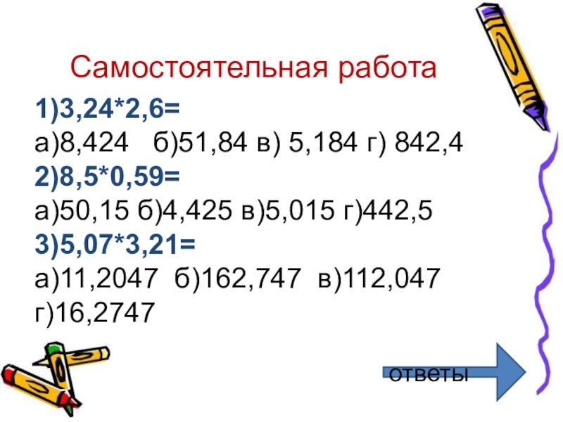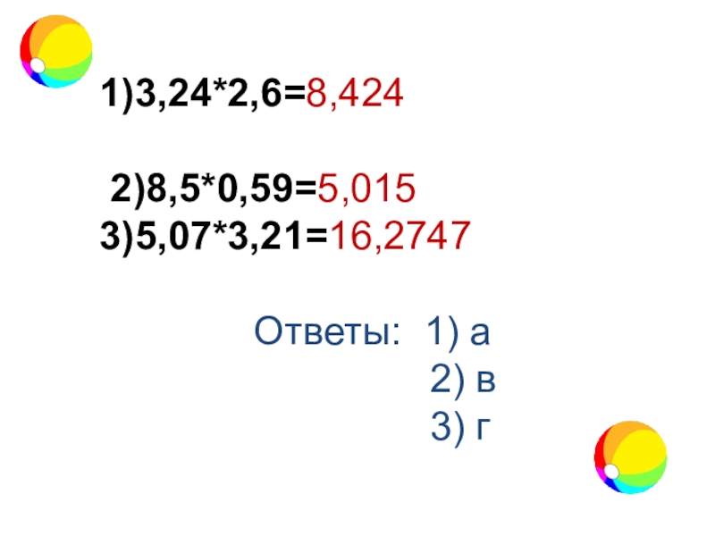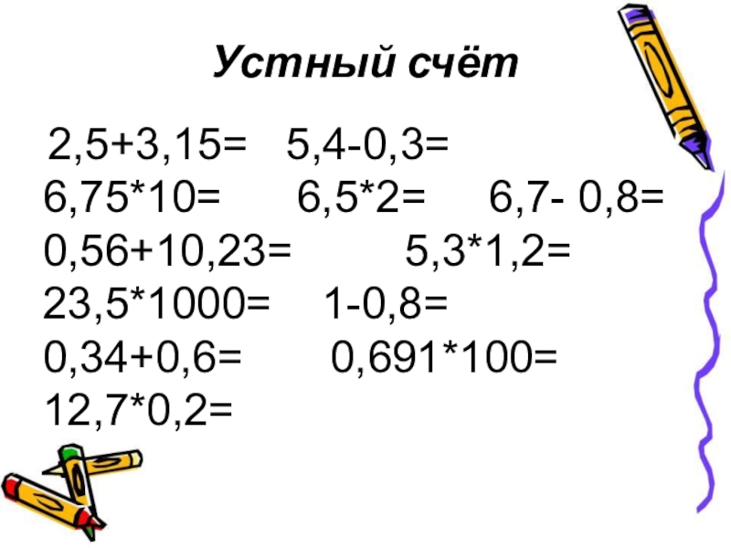 2,5+3,15= 5,4-0,3= 6,75*10= 6,5*2= 6,7- 0,8= 0,56+10,23= 5,3*1,2= 23,5*1000= 1-0,8= 0,34+0,6= 0,691*100= 12,7*0,2=