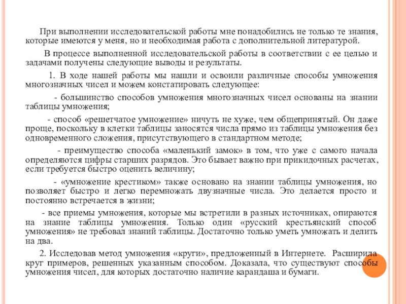 1. В ходе нашей работы мы нашли и освоили различные способы умножения многозначных чисел и можем констатировать следующее: