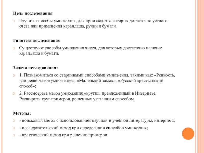 Цель исследованияИзучить способы умножения, для производства которых достаточно устного счета или применения карандаша, ручки и бумаги. Гипотеза исследованияСуществуют способы умножения чисел, для которых достаточно наличие карандаша и бумаги.Задачи исследования:1. Познакомиться со старинными способами умножения, такими как: