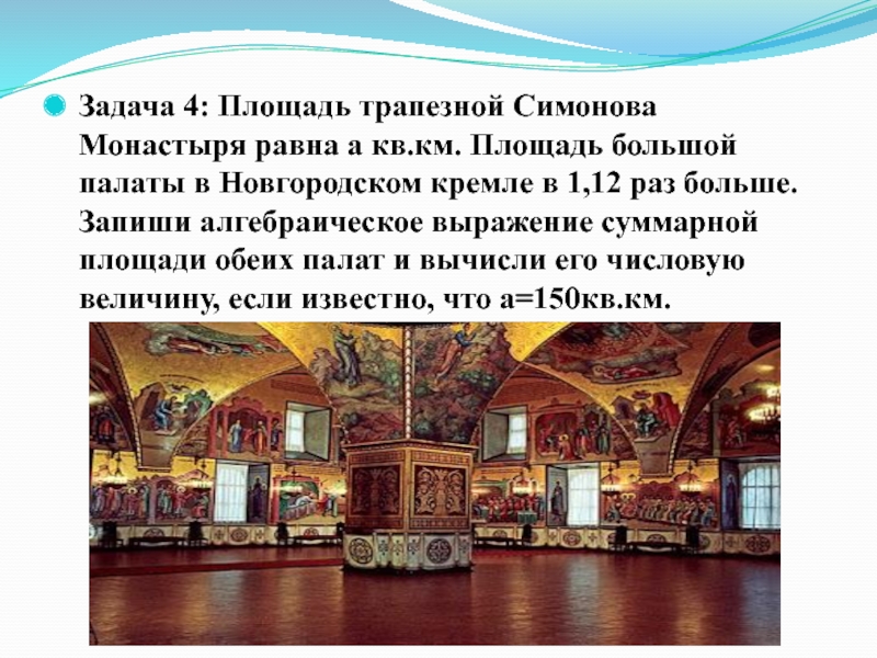 Слайд 10Задача 4: Площадь трапезной Симонова Монастыря равна а кв.км. Площадь большой
