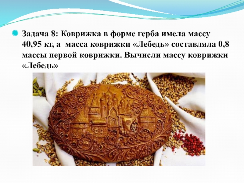 Слайд 14Задача 8: Коврижка в форме герба имела массу 40,95 кг, а