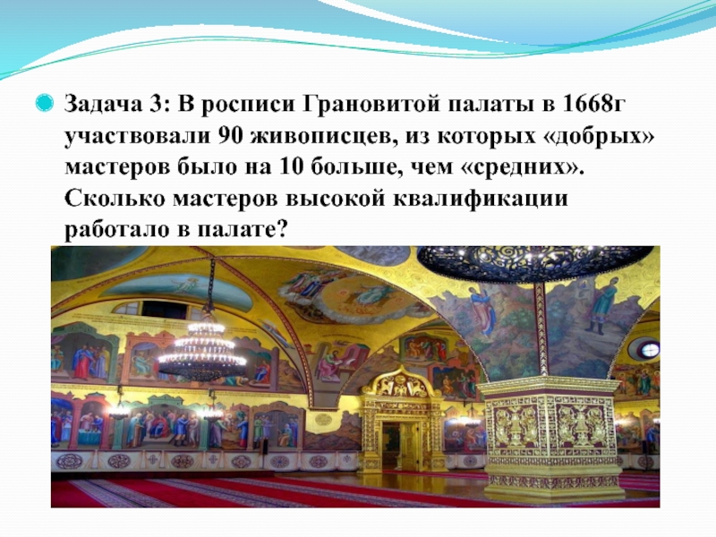 Слайд 9Задача 3: В росписи Грановитой палаты в 1668г участвовали 90 живописцев,