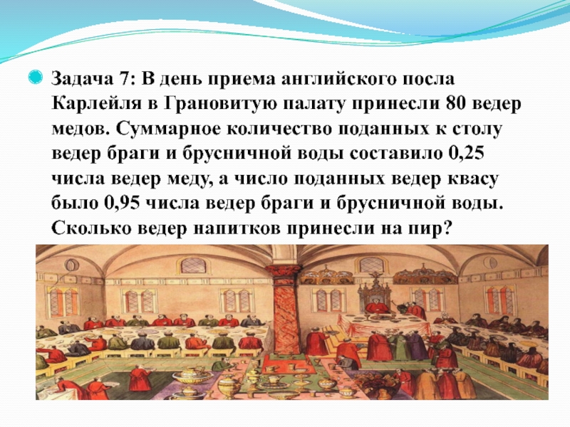 Слайд 13Задача 7: В день приема английского посла Карлейля в Грановитую палату