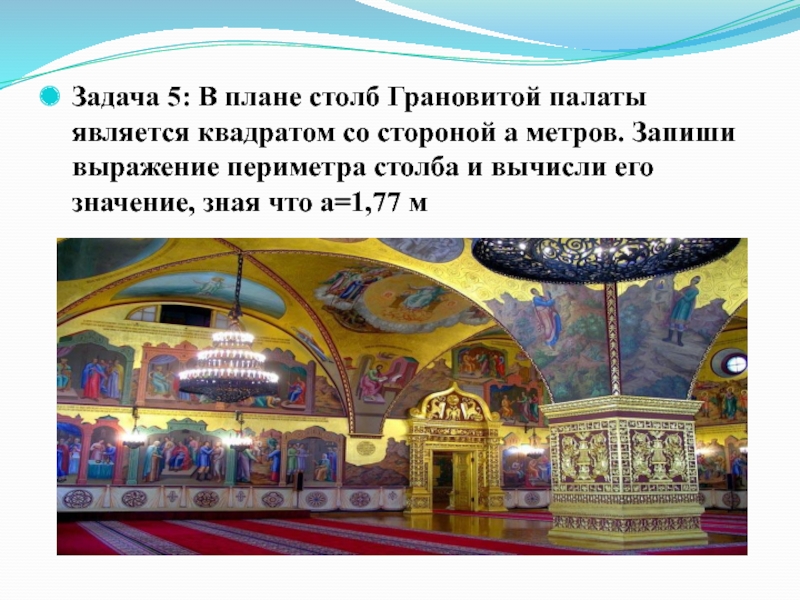 Слайд 11Задача 5: В плане столб Грановитой палаты является квадратом со стороной