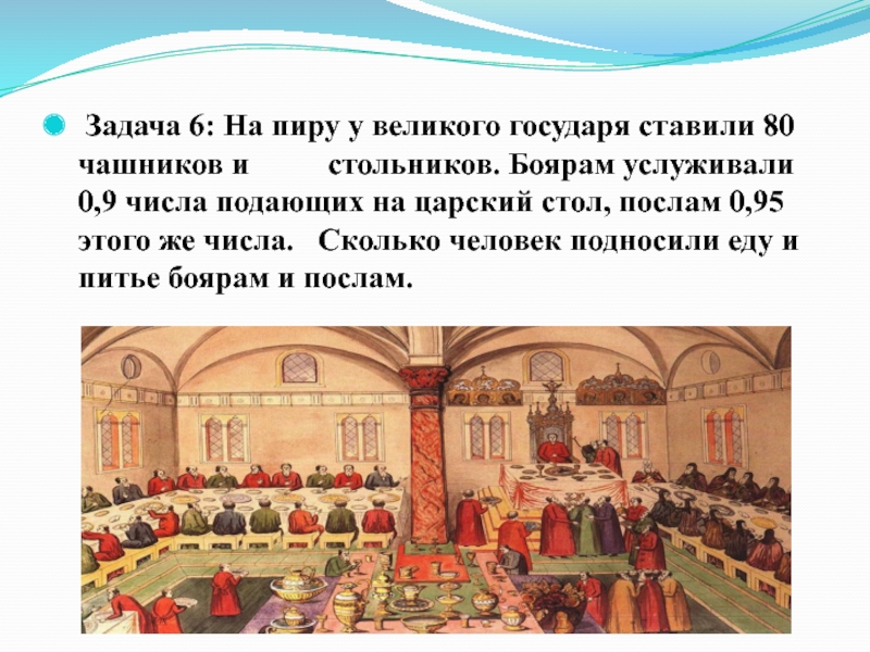 Слайд 12 Задача 6: На пиру у великого государя ставили 80 чашников