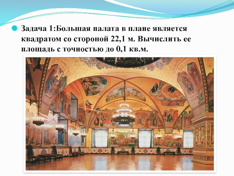 Слайд 7Задача 1:Большая палата в плане является квадратом со стороной 22,1 м.