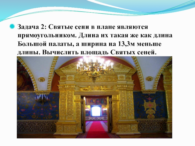 Слайд 8Задача 2: Святые сени в плане являются прямоугольником. Длина их такая