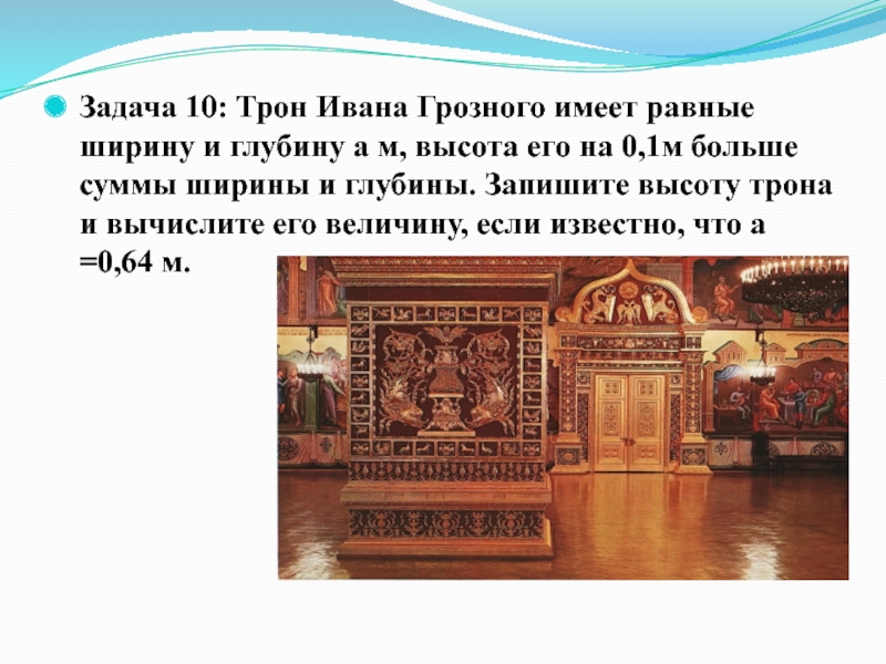 Слайд 16Задача 10: Трон Ивана Грозного имеет равные ширину и глубину a