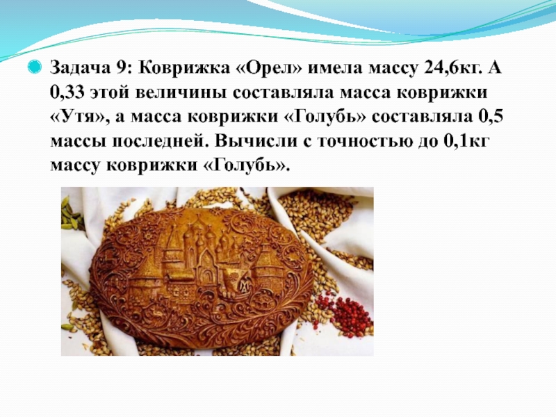 Слайд 15Задача 9: Коврижка «Орел» имела массу 24,6кг. А 0,33 этой величины