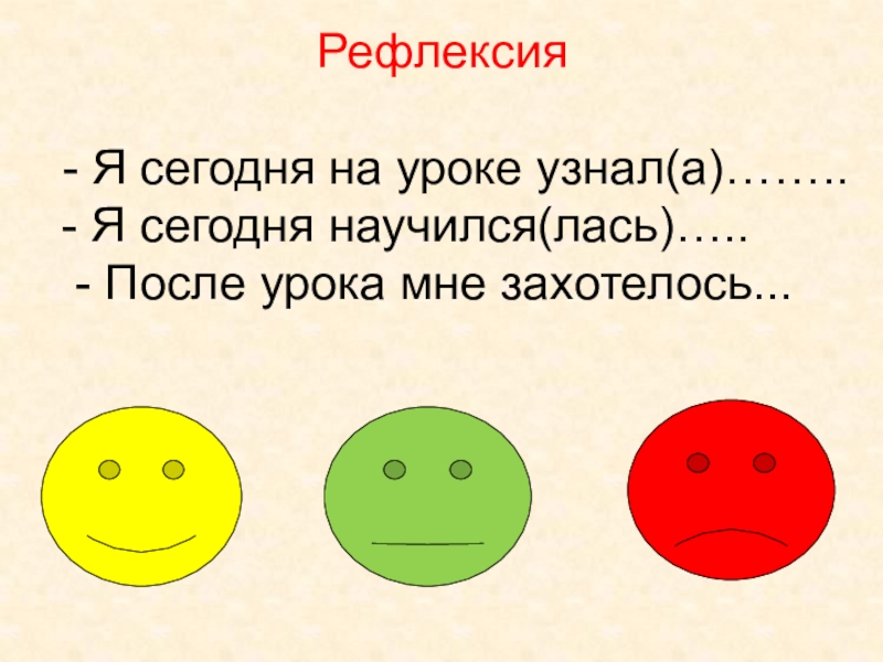 Рефлексия - Я сегодня на уроке узнал(а)…….. - Я сегодня научился(лась)….. - После урока мне захотелось...
