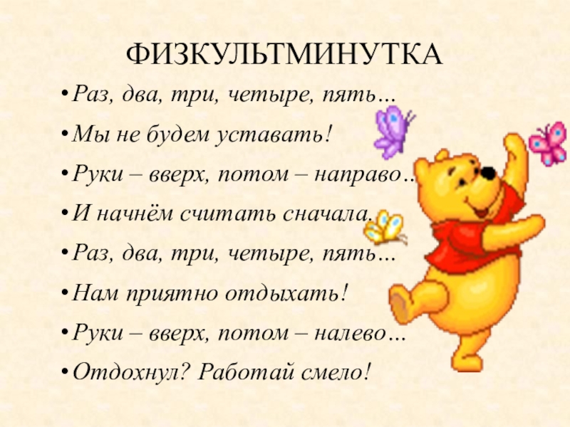 ФИЗКУЛЬТМИНУТКАРаз, два, три, четыре, пять…Мы не будем уставать!Руки – вверх, потом – направо…И начнём считать сначала.Раз, два,