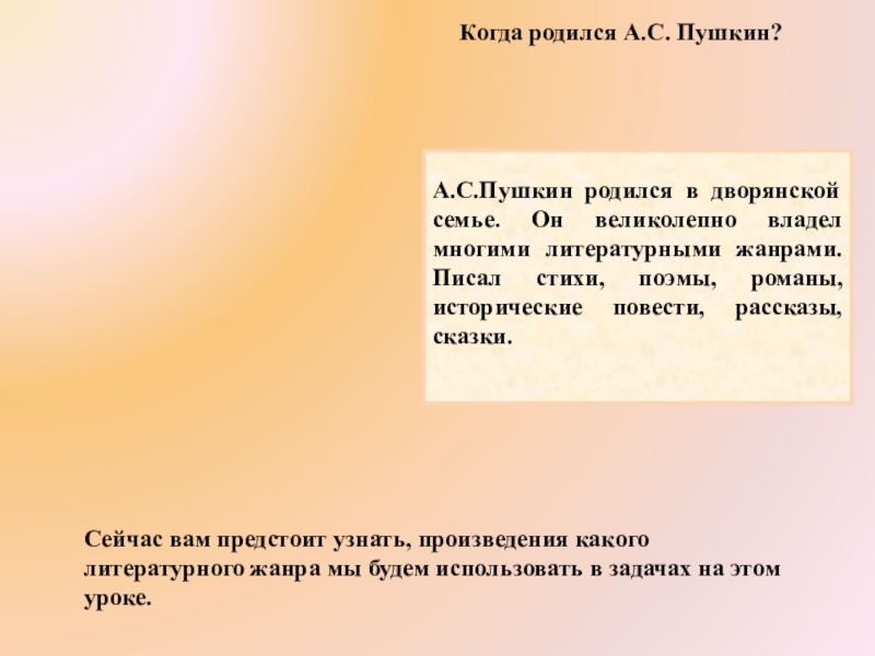 Сейчас вам предстоит узнать, произведения какого литературного жанра мы будем использовать в задачах на этом уроке.