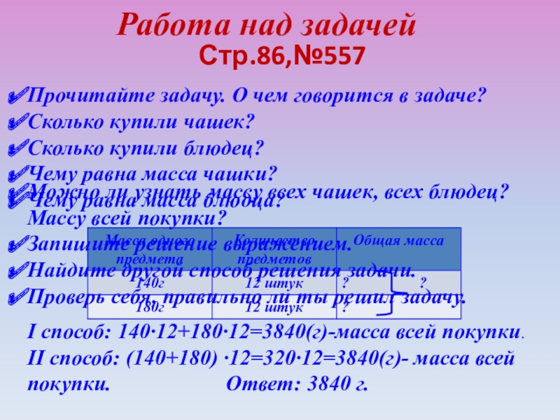 II способ: (140+180) ·12=320·12=3840(г)- масса всей покупки. Ответ: 3840 г.