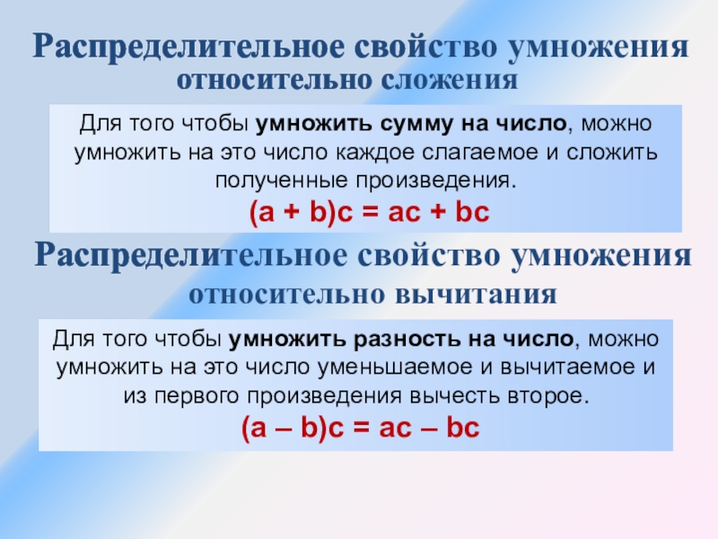 Для того чтобы умножить разность на число, можно умножить на это число уменьшаемое и вычитаемое и из первого произведения вычесть второе.