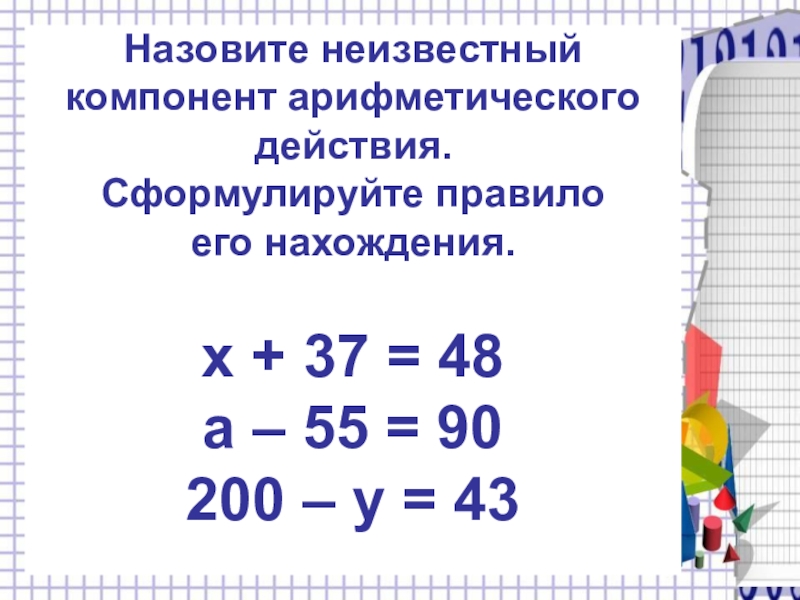 Назовите неизвестный компонент арифметическогодействия.Сформулируйте правилоего нахождения.х + 37 = 48а – 55 = 90200 – у =