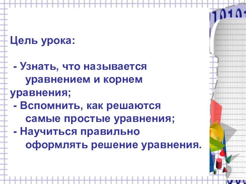 Цель урока: - Узнать, что называется   уравнением и корнем уравнения; - Вспомнить, как решаются