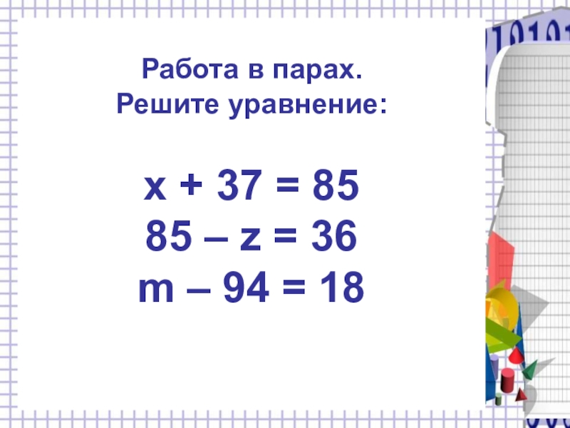 Работа в парах.Решите уравнение:х + 37 = 8585 – z = 36m – 94 = 18