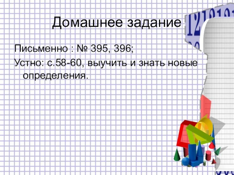 Домашнее заданиеПисьменно : № 395, 396;Устно: с.58-60, выучить и знать новые определения.