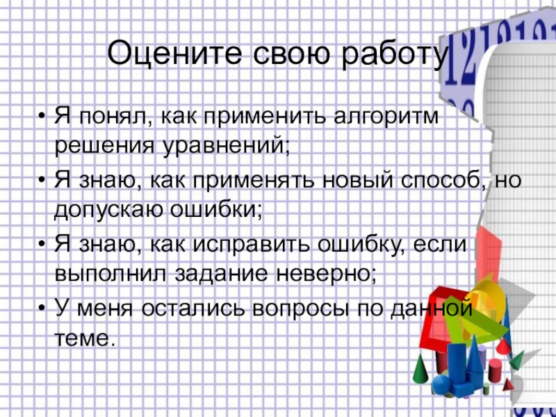 Оцените свою работуЯ понял, как применить алгоритм решения уравнений;Я знаю, как применять новый способ, но допускаю ошибки;Я