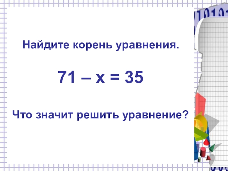 Найдите корень уравнения.71 – х = 35Что значит решить уравнение?
