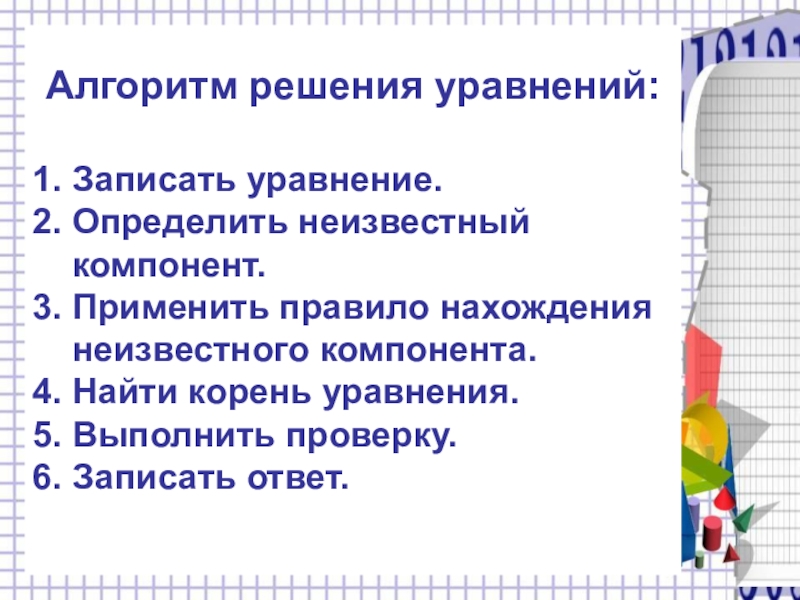 Алгоритм решения уравнений:1. Записать уравнение.2. Определить неизвестный   компонент.3. Применить правило нахождения  неизвестного компонента.4. Найти