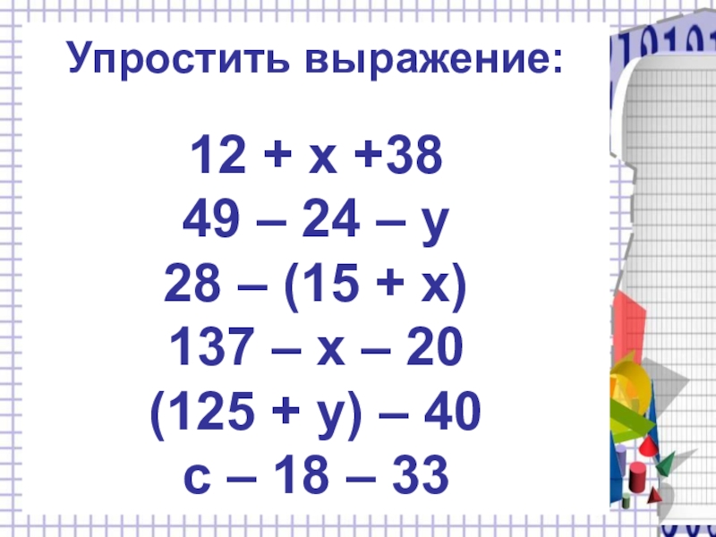 Упростить выражение:12 + х +3849 – 24 – у28 – (15 + х)137 – х – 20(125
