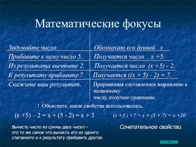 (x +5) – 2 = x + (5 - 2) = x + 3