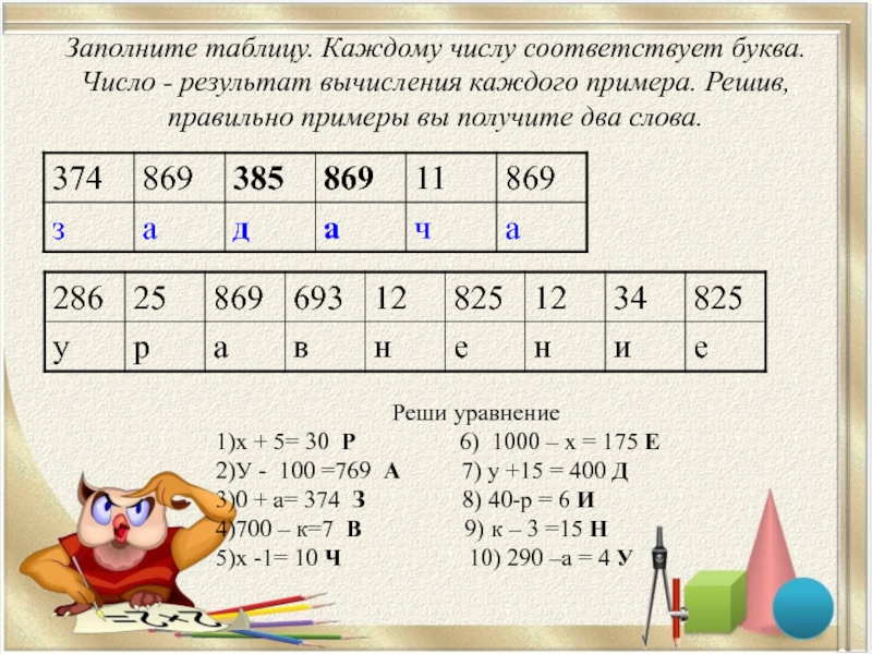 1)х + 5= 30 Р 6) 1000 – х = 175 Е