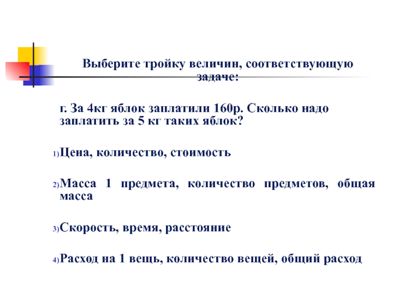 Слайд 13Выберите тройку величин, соответствующую задаче: